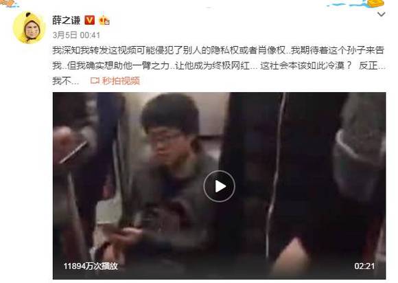 薛之谦这个月出了个负面新闻,转发微博挂了一个17岁男子,因为他在地铁上辱骂两名“扫码创业”的女性。