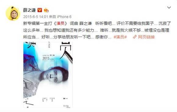 他出的几首歌评价都不错,尤其是这首他自己作曲填词的《演员》,几乎火遍大街小巷。