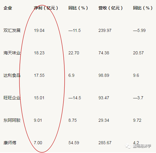 但从净利润来看,双汇、海天、达利、旺旺居于前四,净利均在10亿以上,而销售规模较大的康师傅和统一营收均在百亿以上,但净利却跌落前五名,都在10亿以下。