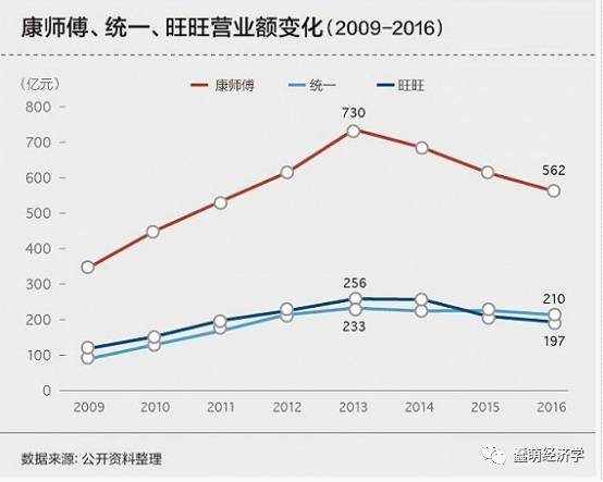 根据三家台企上市之后的2009年到2016年的财务数据,我们明显能看出它们营业额的下滑实际上从2013年就已经开始,且在2013年达到业绩的最高点之后,康师傅和旺旺的下滑幅度均为23%,统一下滑幅度为将近10%。