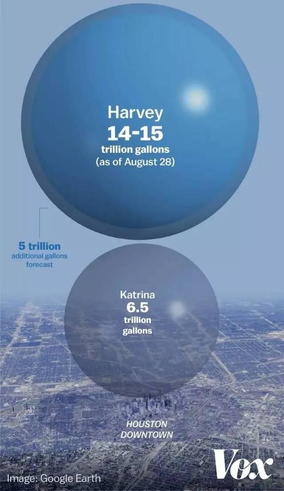 截至昨天,星期一下午,约有14万亿至15万亿加仑(Trillion gallons)的水落在休斯敦及周边地区!预测还有5万亿加仑的水正准备降落在休斯顿....
