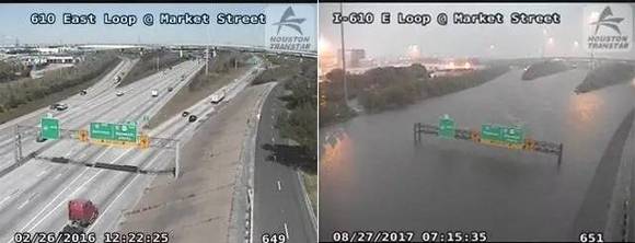 气象频道发布的休斯顿高速公路I-610洪水前后的对比图