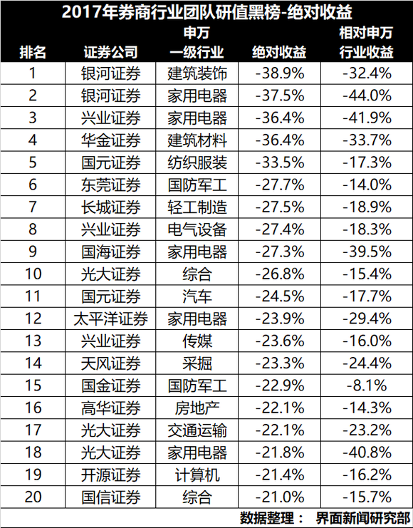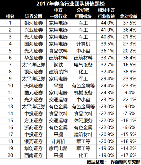 界面新闻以截至8月20日以来74家券商研究所2万余份买入评级研报为基础,以个股相对于申万一级行业的相对收益表现作为评价标准,对1023个券商行业研究中相对收益表现最不好的前20名予以列示,具体评价方式详见文章(两万份买入评级研报分析告诉你谁是券商“黑嘴” 民生证券表现最差)。榜单结果显示,银河证券、兴业证券、光大证券、国海证券、华金证券五家券商登上前五名,具体榜单结果如下: