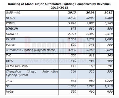 全球车灯厂商2013-2015年销售数据,单位:百万美元。