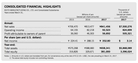 KOITO 8月28日刚刚公布的年报(截止2017年3月31日)显示,其2017财年销售收入为8414.5亿日元(约75亿美元),同比增长3.4%。