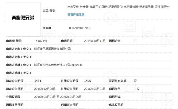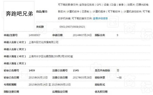 高沃小知从商标局查询得知,上海午际公司在2014年7月24日提交了“奔跑吧兄弟”第9类商标的注册申请,比正主浙江蓝巨星公司2014年10月11日早提交了2个多月成功注册了下来。