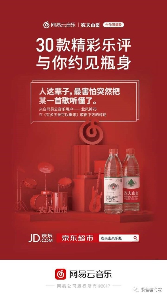 瓶装水是网易云音乐推广的新场景、新渠道。贝恩《2017年中国购物者报告》显示:快消品行业整体下滑,瓶装水品类的增速仍然十分迅猛,农夫山泉在过去一年甚至有超过20%的增长。