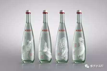 农夫山泉玻璃瓶高端矿泉水分别选取了长白山的典型天气和植物,分别是雪花、山楂海棠、蕨类植物和红松果实以及东北虎、中华秋沙鸭、红松等长白山特有的物种为设计元素,但是玻璃瓶器形却莫名撞脸依云的限量瓶。
