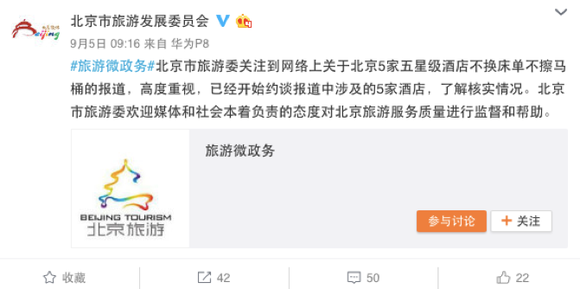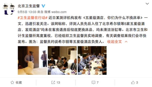转眼到了周末,9月9日,北京市卫生和计生监督所完成了全面检查五星级酒店的承诺,央视也第一时间对检查的结果进行的了报道《北京检查五星级酒店:未发现不换床单不擦马桶》。虽然群众们对于事先早就打好预防针的“突击”检查效果并不买单,但从官媒口径来看,至少五家酒店公关负责人稍微松了一口气。