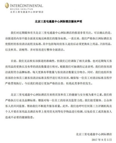 随着执法部门的介入调查以及事件的扩大发酵,9月5日下午,第一个质疑评测真实性的北京三里屯通盈中心洲际酒店,也第一个主动发布官方媒体声明。