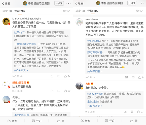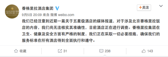 随后,9月5日20:09,事发30个小时后,香格里拉集团也站了出来,在其官方微博就事件作出了回应,使用了与洲际酒店类似的口径,不承认自己有问题,强调“无法核实其准确性”。