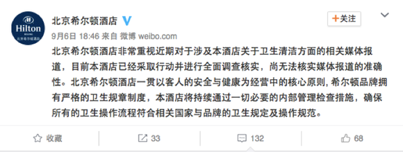 一天后,9月6日18:46,北京希尔顿酒店作出回应,再一次与洲际、香格里拉“两位兄弟”保持默契。