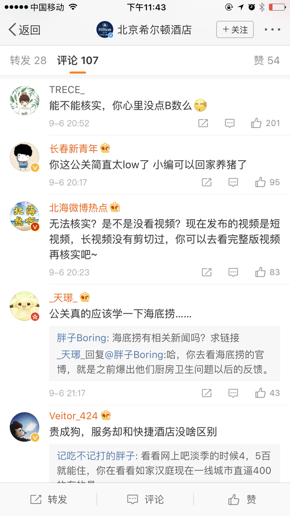 (@北京希尔顿酒店官博评论区恶评如潮)