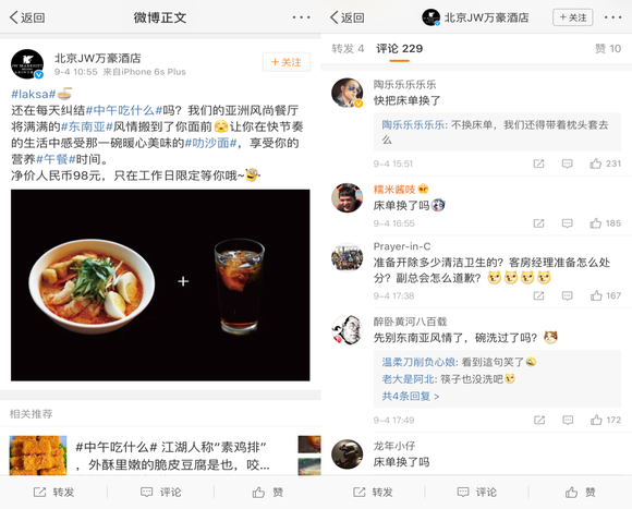 而北京JW万豪和长安街W酒店依然没有给出答复,它们最新的官微仍在介绍着诱人的美食,可是评论区网友们关心的却都是“你家床单换了没?”。