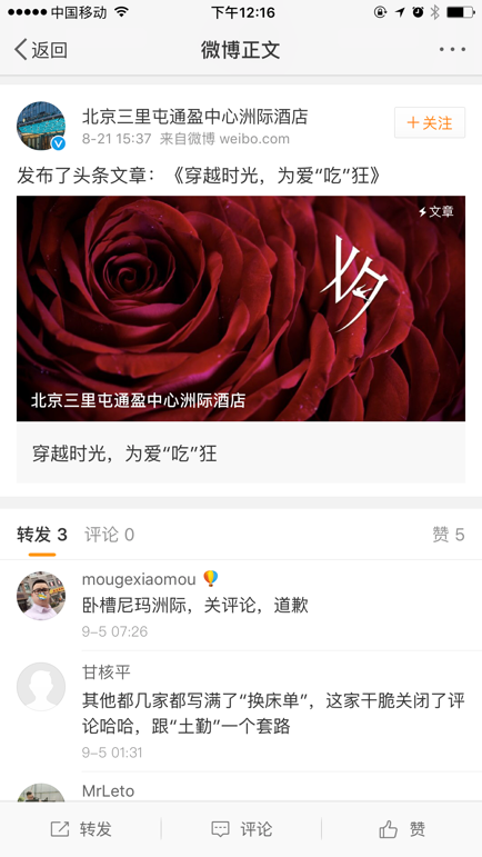 (@北京三里屯通盈中心洲际酒店 官博关闭评论)