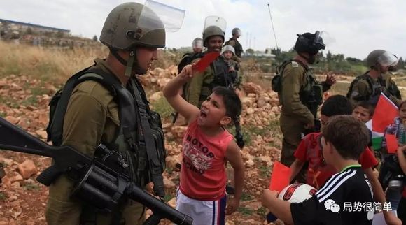 (以色列士兵面对激动的巴勒斯坦儿童)