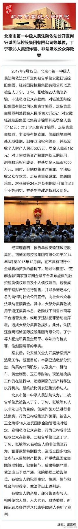 e租宝案宣判:涉案公司被罚19亿 主犯丁宁被判无期徒刑