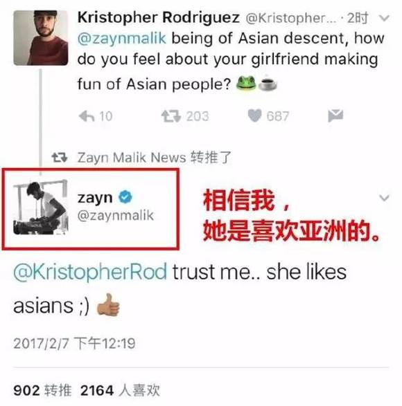 Zayn 转推回复网友:请相信我,她是喜欢亚洲的。