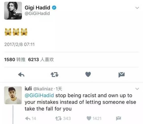 作为一个有着亚洲血统的人,Gigi 男友 Zayn (其父是英国裔巴基斯坦人)还被网友直接艾特追问:作为一个有着亚洲血统的人,你怎么看待女友取笑亚洲人?