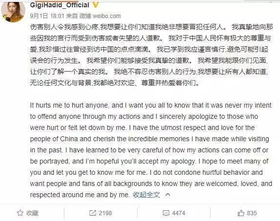 面对中国网友的强势炮轰,Gigi 也只好妥协,通过新浪微博发了一封致歉信。中国网友不但丝毫不领情,火还被拱大了,网友纷纷表示,道歉信是中英文双语,傻子都看得出是公关团队写的,一看就没什么诚意,而且到现在 Gigi 的外国社交软件上也没有任何与道歉相关的文章。