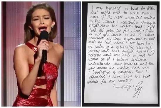 为什么大家如此气愤呢?是因为之前,Gigi 就因为在 AMA 模仿新上任美国总统太太的中欧口音,被指种族歧视,不过她事后可是亲手写了致歉信。
