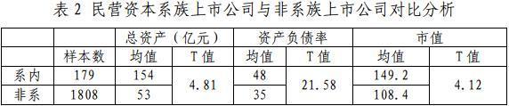 从表2中可以看到,民营资本系族上市公司的总资产均值、资产负债率均值以及市值均值都显著高于非系族上市公司。比如,本报告统计的179家民营系族上市公司和1808家非系族上市公司,总资产均值分别为154亿元和53亿元,前者显著高于后者(T值为4.81)。
