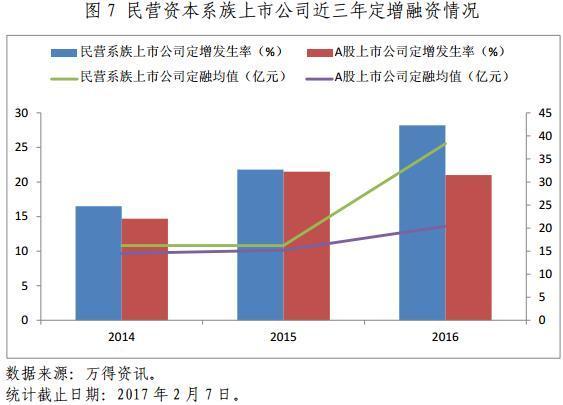 民营资本系族上市公司定增发生率及融资均值高于A股市场整体水平。从图7中可以看到,近三年来,民营资本系族上市公司进行定增增发的概率以及每笔定增的融资额均值均高于A股上市公司整体情况。