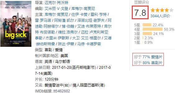 豆瓣评分7.8,好于77%爱情片&80%喜剧片。