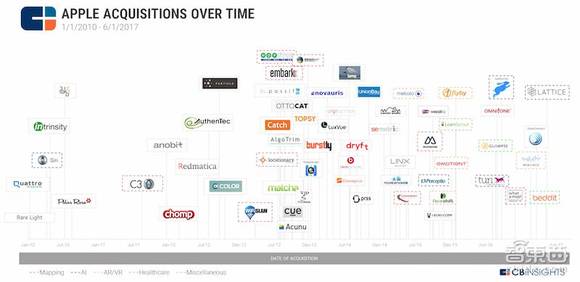 除了芯片之外,从2010年至今,苹果已经陆续收购了好几十家创企,包括语音识别、图像/面部识别、计算机视觉、AR、数据挖掘、机器学习、地图、定位等等,而这其中几个比较具备代表性的有: