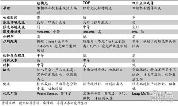 双目立体成像方案软件算法复杂,技术还不成熟;结构光方案技术成熟,功耗低,平面信息分辨率高,但是容易受光照影响,识别距离近;TOF 方案抗干扰性好,识别距离远,但是平面分辨率低,功耗较大。
