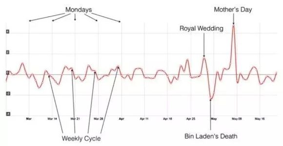 大部分文本情感可视系统都是以展示基于时间轴的信息流为主,像是今日头条上的新闻、微博信息流、商品的用户评论等等。下图是一张twitter数据的情感时间序列图,其中正向的值代表积极情绪,负向则是消极情绪,这张图展现了在时间轴上各个不同事件对于网民twitter情绪的影响。