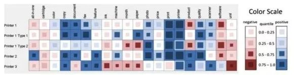 下图的可视系统例举的是顾客对某款打印机评论的可视化分析结果,以热力图的方式同时展示了评论量和情感。其中每一行代表一种品类的打印机,每一列则是打印机的某一属性,红色表示消极情绪,蓝色则代表正面情绪,颜色的深浅程度代表该情绪的高低,每一个方格中的方块大小表示评论数量。这种可视化方式,不仅合理地将情绪极性数据同产品的各个维度结合在一起,还简洁、高区分度地呈现出数据分析师最想第一时间获取的关机讯息:情感极性。