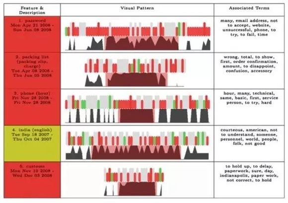 Rohrdantz在2012年在ACM Trans上发表了一整套完整的用户评论情感可视系统,该系统整合了文本挖掘、情感分析与可视分析技术,帮助系统使用者提取文本中的有意义信息,比如情感变化、数据密度、关键词等等。下面的热力图展示了时间线上的情感变化,其中每一个像素点代表一条文本,绿色为积极情绪、红色为负面情绪、黄色为中性情绪。该图以日历的形式展现整体时间线上的情感分析结果。