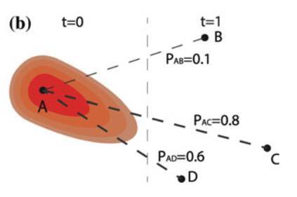 OpinionFlow是一套专门面向社交媒体的意见传播可视分析系统。对于某一个特定的主题,OpinionFlow会分析一系列用户发布的相关Tweet,对于每一个用户u在时间t上发表或者转发的相关推文,系统会计算出情感值并记录为S(u,t)。通过对现有传播模式的识别,系统能够推断一个用户u把意见传播给另一个用户v的可能性Puv。下图是一个简单的意见传播示意图,分别表示了A向BCD传播的可能性。