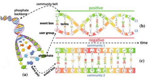 SocialHelix的灵感来自于DNA螺旋结构(下图a),能够充分展示意见分歧中需要包含的用户群、焦点事件以及观点情绪等因素。b图中双螺旋的两条主链(backbone)分别代表情感意见相反的两个群体,而碱基对(base pairs)则代表发生的焦点事件,磷酸基团(phosphate)代表了该事件中该群体发表意见的典型代表用户,图中越接近上方情绪越积极,反之则越消极,同时也以红绿黄三色对情绪作出了标识。c图以另一种形式展示了同样的数据,仅以颜色体现正负情绪观点,相较之下b图更为直观。