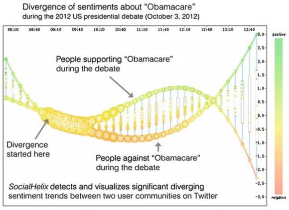 另一个社交媒体可视化系统的例子是SocialHelix,分析社交媒体上出现的用户意见分歧。所谓用户意见分歧是指比如在政治运动中,不同党派的支持者在社交媒体上根据自己的政治观点进行辩论。意见分歧产生的条件是必须至少有两组持有不同观点的人,其次在一系列相关的焦点事件中他们会发表各自阵营不同的意见。