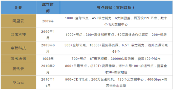 据各方公布的最新的节点数据来看,阿里云和网宿科技的节点资源可能最为丰富(均在1000+)。带宽能力上,阿里云与腾讯云名列前茅。在海外布局上,各家均部署大量节点,但是数量上和实力上仍有不小差异。