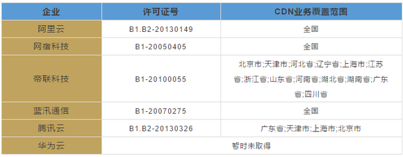 阿里云、网宿科技作为2016年12月12日就最早获得工信部CDN牌照的企业,在业务覆盖范围数据上显示出相当的实力。蓝汛作为2000年首家获信产部(工信部前称)许可的CDN服务提供商,有着18年的专业服务经验。帝联科技作为成立较早的CDN领域豪强也是实力强劲。腾讯云的业务目前基本上在全国各地都有开展,但是在牌照业务还是被限制在四个省市,未来在换牌时可能扭转这一局面。而作为商用进度较慢的华为云在这项业务上仍未取得工信部的认证许可。
