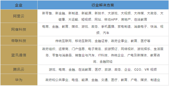 看上去,每家企业的行业解决方案似乎差别不大,但还是各有特点的。阿里云聚焦“五新”,方案更强调未来场景,此外在游戏、视频、传媒等领域充分释放计算和智能技术,在价格上,阿里云在合并优酷CDN业务后宣布降价35%,在视频传输领域颇具实力,此外在央视CDN招标及银行体系金融云中经常出现阿里云的身影。网宿科技、帝联科技、蓝汛通信则还是维持过去十几年中积累的CDN老客户,未来的云业务可能会顺利承接。腾讯云CDN的应用场景大多在腾讯体系产品及合作伙伴,在社交、游戏、直播领域应用较多。华为云目前在2B和2C上相比阿里云等企业都比较弱,云业务上对接的更多是政企客户,从2016-2017年与各地市政府合建的数据中心可得知。