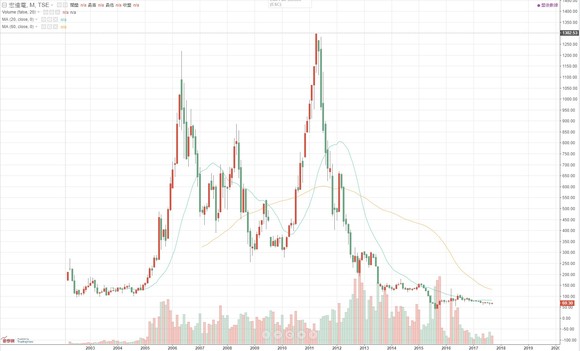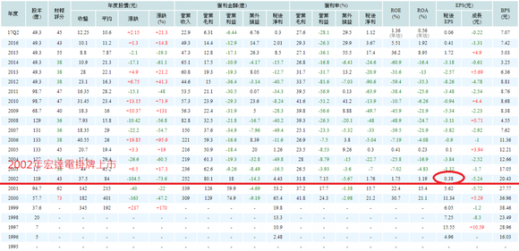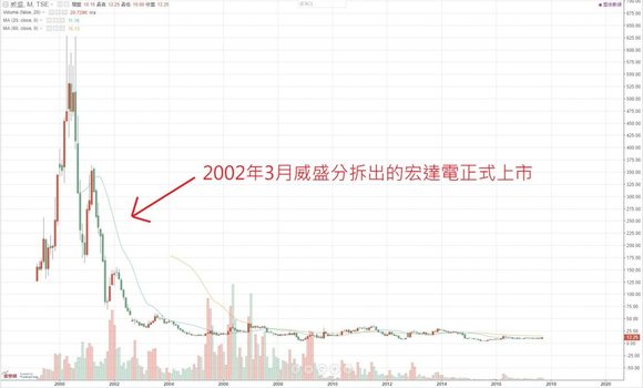 2000 年威盛税后 EPS 是 11.34 元台币、2001 年还有 5.62 元台币,2002 年宏达电挂牌上市,威盛税后 EPS 只剩 0.38,股价也像泄了气的皮球,从 629 元台币一度跌到 10 元台币以下,2015 年最低点每股剩下 5 元台币。