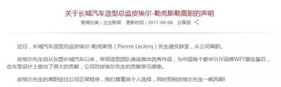 就在9月8日,长城汽车正式在官方网站上发表了一则声明,对原总监皮埃尔·勒克莱克的辞职说出了说明。虽然行文算是规整,但字里行间扔能看出长城汽车对于皮埃尔·勒克莱克辞职的不舍与无奈。