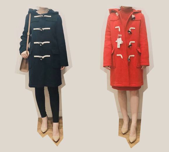 这件是直筒版型,一共有3色可选。灰色偏老气,深蓝色最好看,也最好搭。红色很正,但颜色太鲜亮有点扎眼睛,像look book那样内搭同色针织裙,还蛮好看的,有日式学生妹的味道,还带点英伦风。
