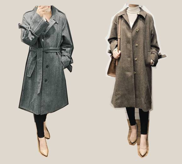 灰色的比较酷,可以放心,上身不老气。深褐色更温柔一点,搭配米白色的毛衣或高领衫特别好看,复古又摩登,强烈推荐。