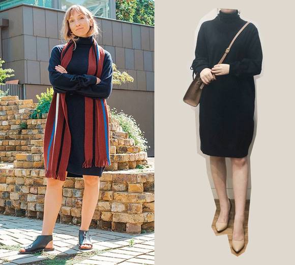 中间那款是100%山羊绒质地,上身柔软不刺人。袖口有细细的针织飘带,可以系成蝴蝶结,也可以放下来甩啊甩。整体偏H型,裙摆略向里收。因为是高领,所以不适合脖子短和大胸妹子。