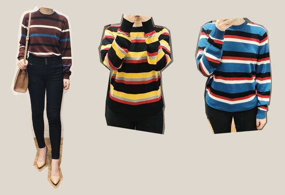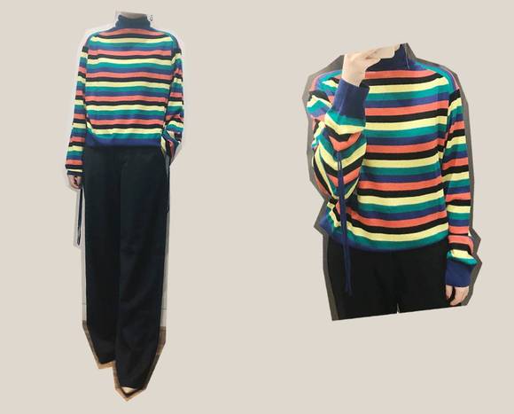 这一季还出了很多撞色条纹衫,下面试的都是男女同款。材质纯羊毛,只是没有高领,也没有袖口的蝴蝶结,算是基础款。冬天穿穿不沉闷,还蛮好。