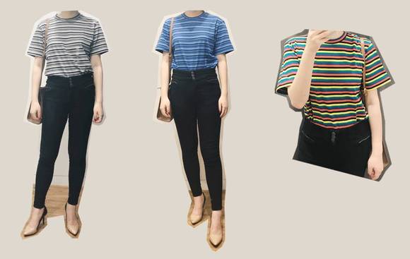我自己入了撞色条纹T,也是男女同款,纯棉的只要99!最小码我穿刚好,不会偏大。因为着了彩虹条纹的魔,所以就剁的它,搭黑裤子巨好看。还有灰色和蓝色条纹可选,但个人觉得太普通没啥特色,估计更适合男生吧~