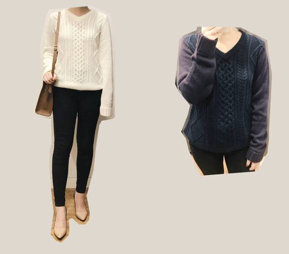 同样英伦学院派的还有一款V领毛衣,它是非常经典的纽花图案,领口和袖口有很精致的罗纹编织。这款比较修身,冬天当内搭不会臃肿。缺点是羊毛含量低,上身不太舒服,但里面穿衬衫的话就能既舒适又时髦啦~