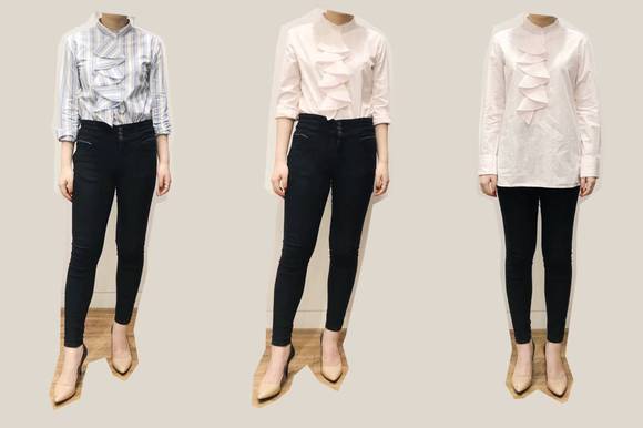 作为衬衫控,Miss 烧饼还试了几件衬衫。它不是垂感面料,胸前有荷叶边,不太适合大胸。试穿时荷叶边都被压扁了,有点死板,但洗过应该会很灵动~