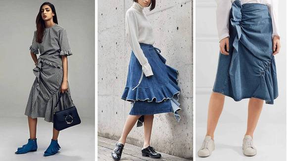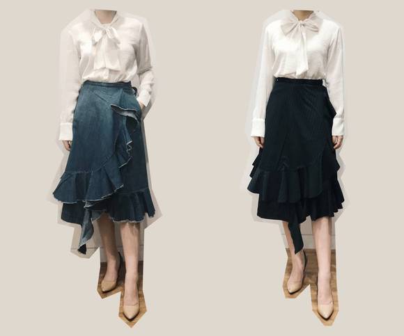 除了上衣,下装也能看到很多JWA的符号。这条不对称荷叶边裙,是不是很眼熟?其实这是JWA的经典单品,好几季里都能看到类似的影子。