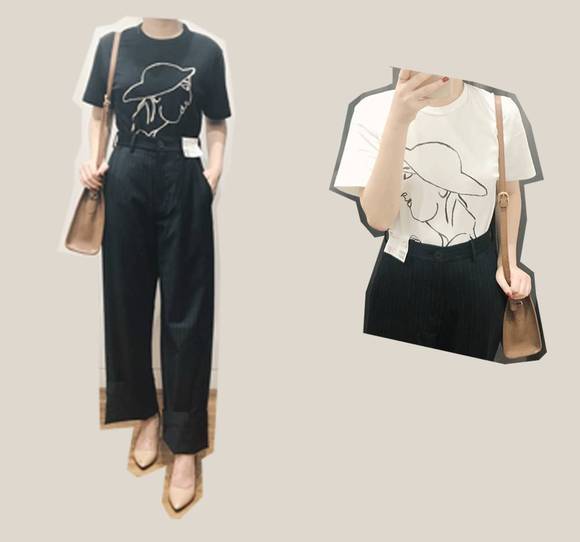 最后还有几款没法归类的上衣。一件是T恤,上面印着很好看的简笔画,版型很显瘦,材质也是很舒适的纯棉,搭配阔腿裤、牛仔裤就很好看。